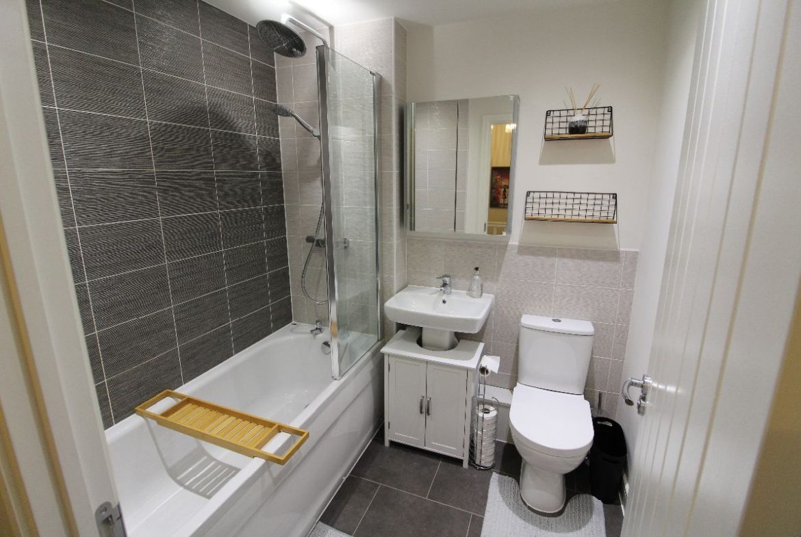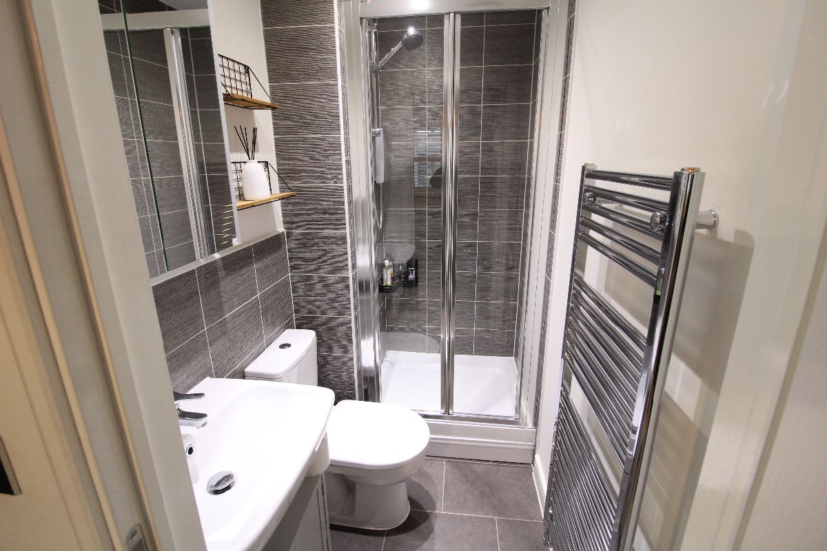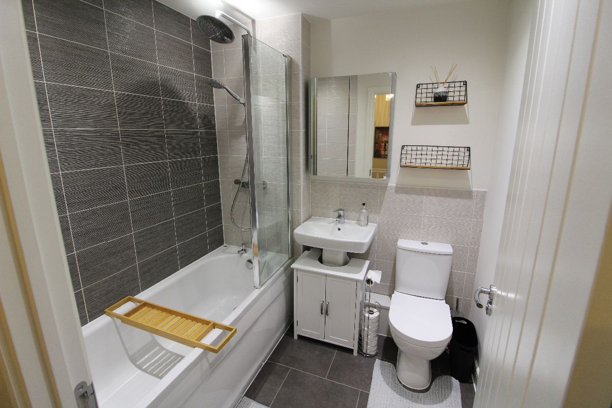 Panel enclosed bath with Thermostatic rainfall shower over, low flush wc, sink and pedestal with mixer tap, towel radiator, spotlights to ceiling, tiling to splash areas, extractor fan, tiled effect Amtico flooring.