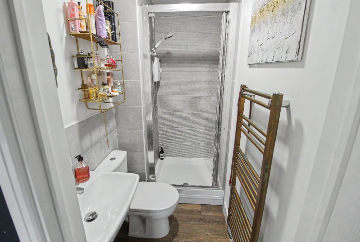 Shower cubicle with electric shower over, low flush wc, sink and pedestal with mixer tap, towel radiator, extractor fan, Amtico timber effect flooring.