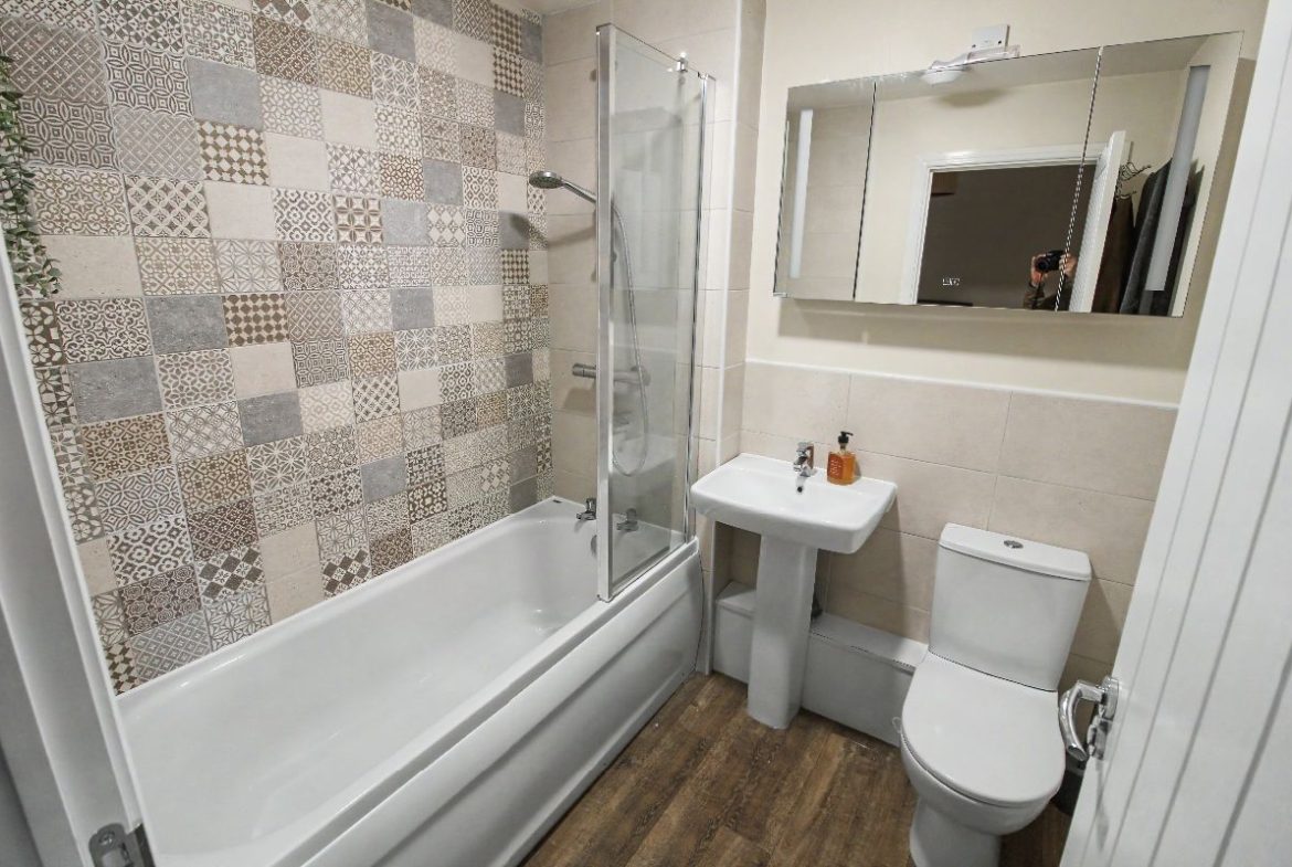 Panel enclosed bath with Thermostatic shower over, low flush wc, sink and pedestal with mixer tap, towel radiator, extractor fan, Amtico timber effect flooring.