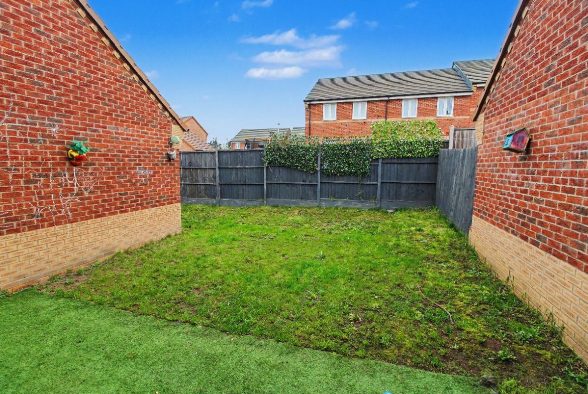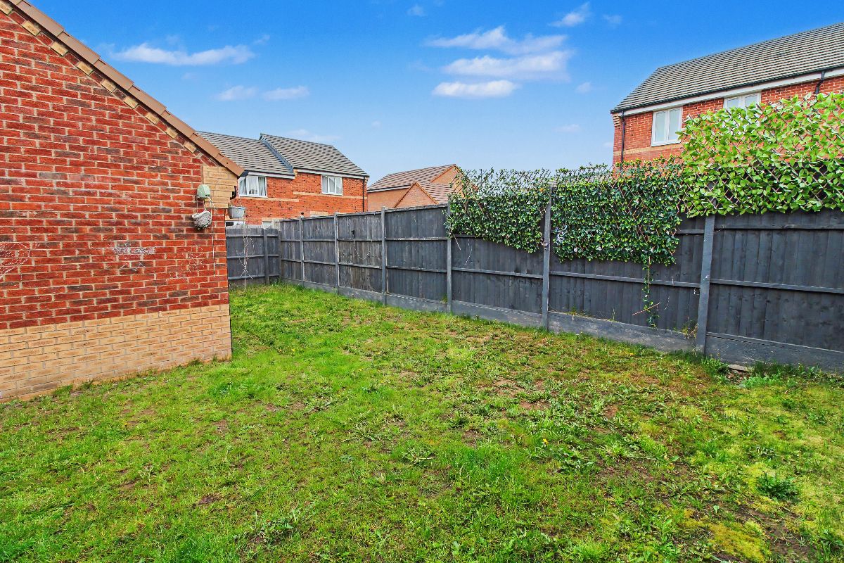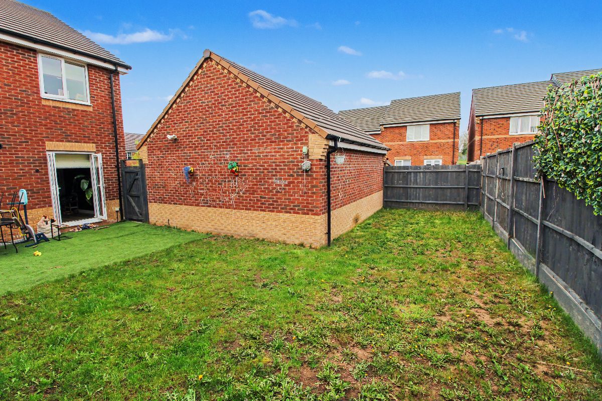 Artificial grass leading to lawned rear garden which extends to the side and behind the garage, side gate to driveway.